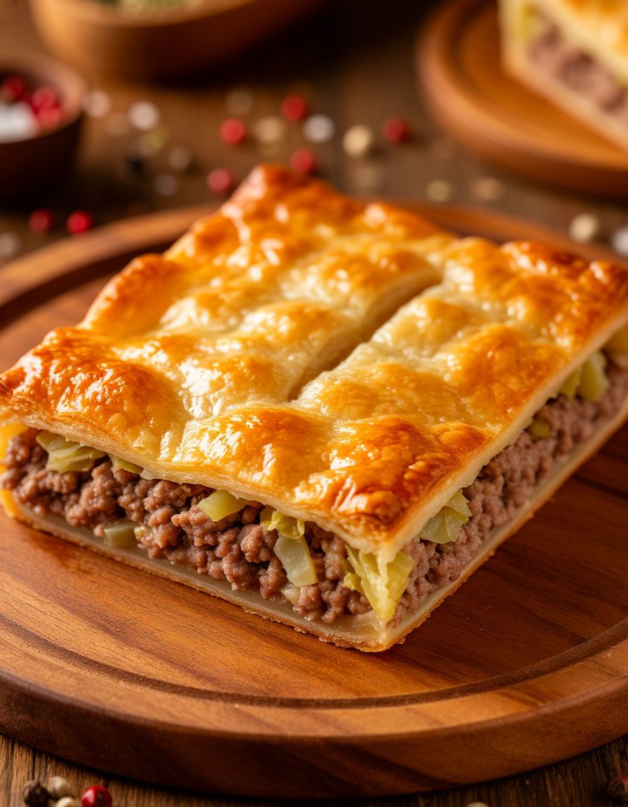 Фарш (курица, свинина), капуста тушеная, лук пассированный, специи. Тесто дрожжевое или слоёное на выбор.