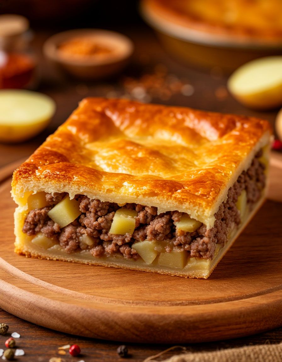 Фарш (курица, свинина), картофель, специи и лук. Тесто дрожжевое или слоёное на выбор.