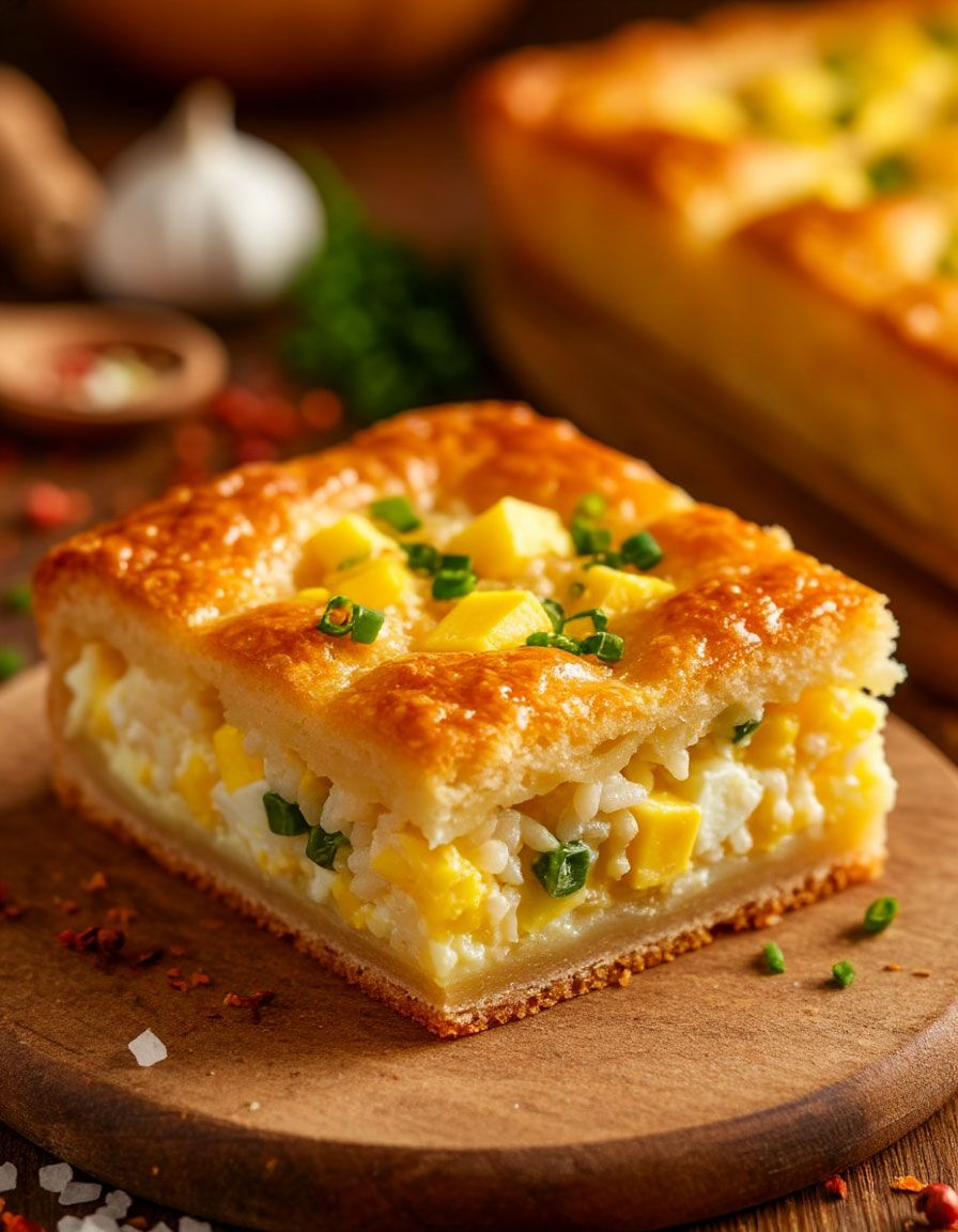 Пирог с рисом, яйцом и зеленым луком